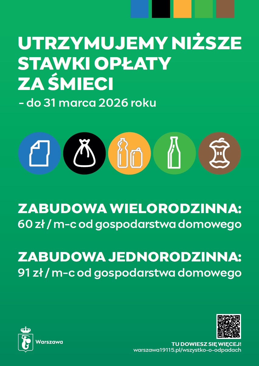 Informujemy, że Mieszkańcy Warszawy nadal będą płacić mniej za gospodarowanie odpadami. Rada m.st. Warszawy zdecydowała o przedłużeniu obowiązywania obniżonych opłat za odpady od mieszkańców stolicy. Niższe stawki mają obowiązywać do 31 marca 2026 r.