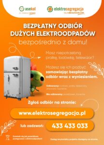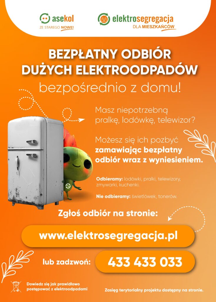 Każdy właściciel lokalu mieszkalnego ma prawo do bezpłatnego odbioru dużego gabarytowo elektrośmiecia (lodówka, pralka, etc). Wystarczy zadzwonić pod numer: 433 433 033 lub zgłosić poprzez stronę www.elektrosegregacja.pl