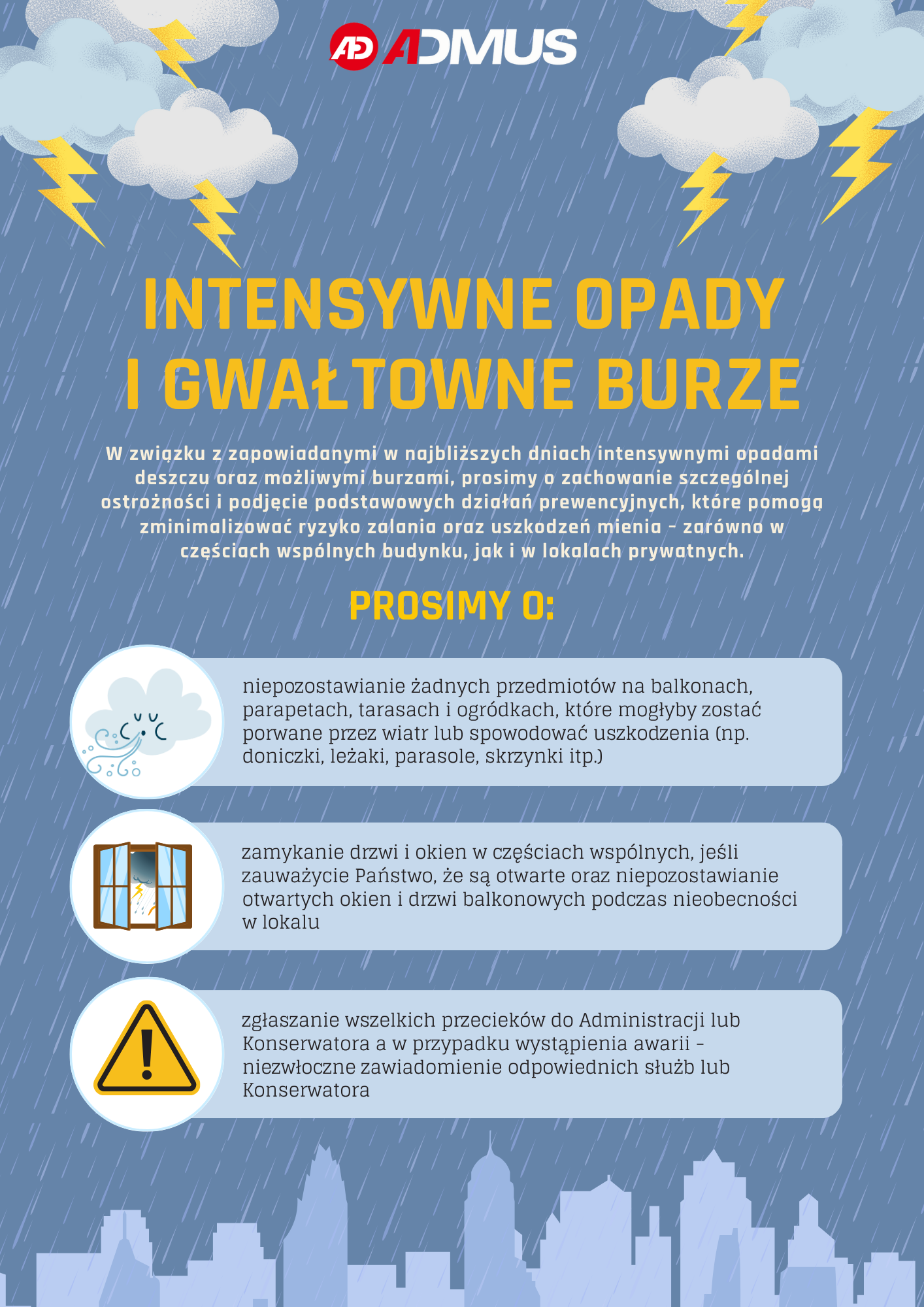 Niebezpieczne burze, gwałtowne opady Opublikowany 14 lipca 2025 przez Uwaga na intensywne opady deszczu i burze. Prosimy o nie pozostawianie wolnostojących mebli na balkonach i tarasach oraz nieprzymocowanych donic na balustradach. Mogą one stanowić realne zagrożenie w przypadku silnych wiatrów.