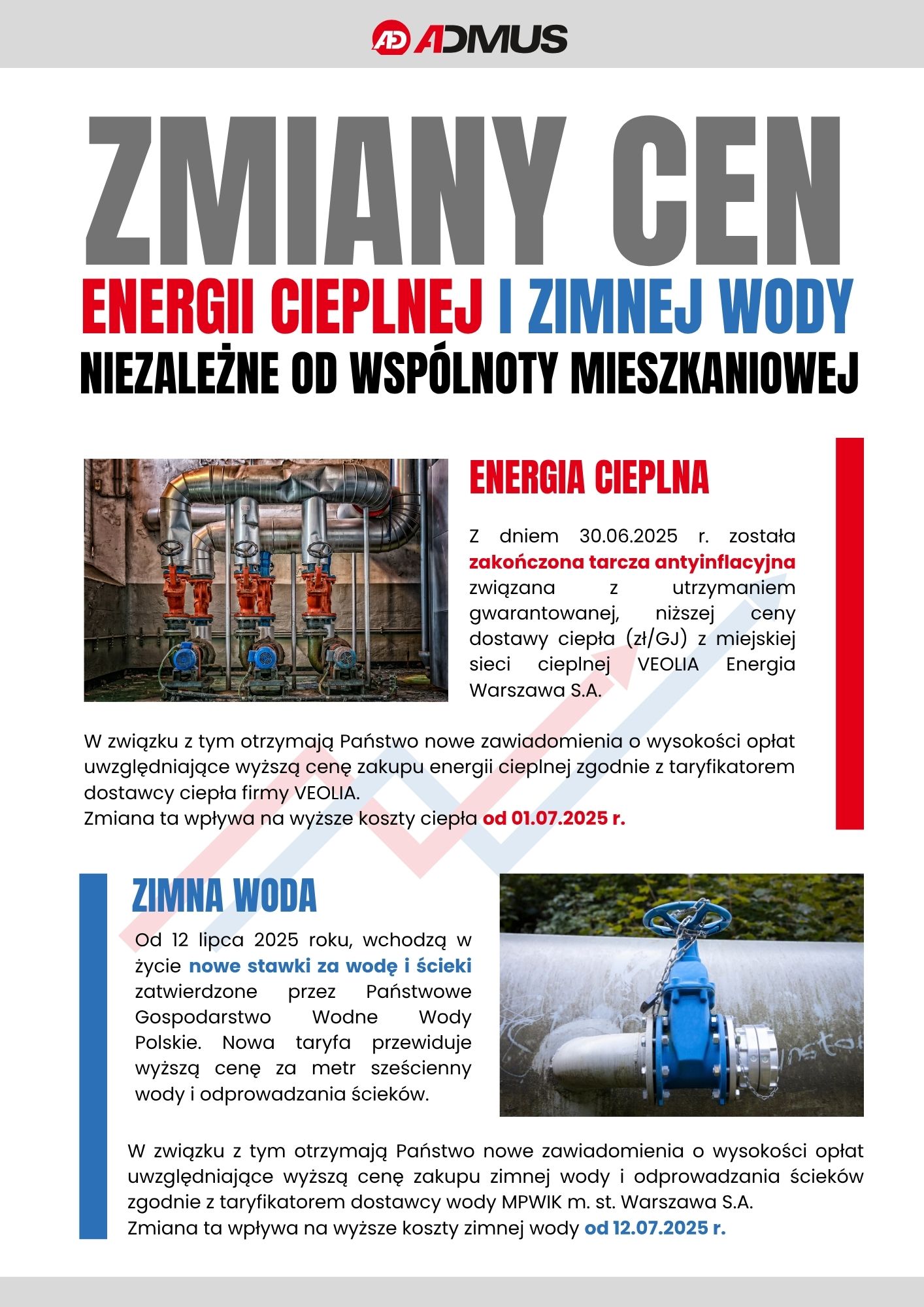 Zmiana cen wody od 12 lipca Opublikowany 5 sierpnia 2025 przez Informujemy, że zmianie uległa cena wody ustalona przez MPWiK w Warszawie. Nowe naliczenia zostaną wykonane przez dział księgowości.