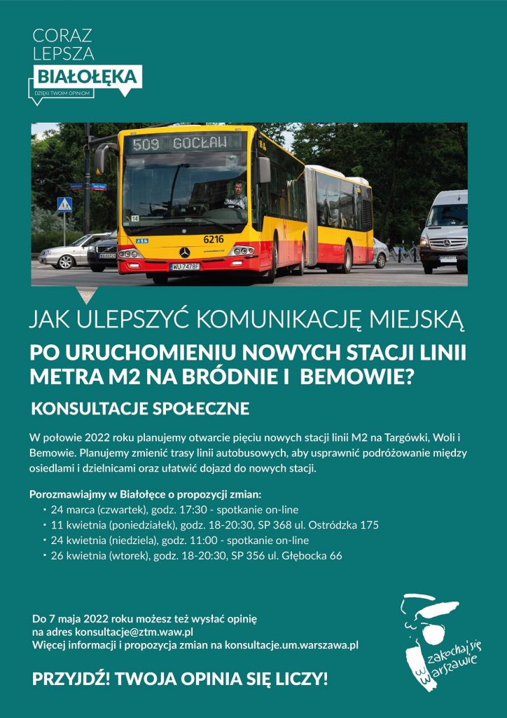 Wnioski w przedmiotowej sprawie mogą Państwo zgłaszać również drogą elektroniczną na adres: konsultacje@ztm.waw.pl. Termin: 7.05.2022
