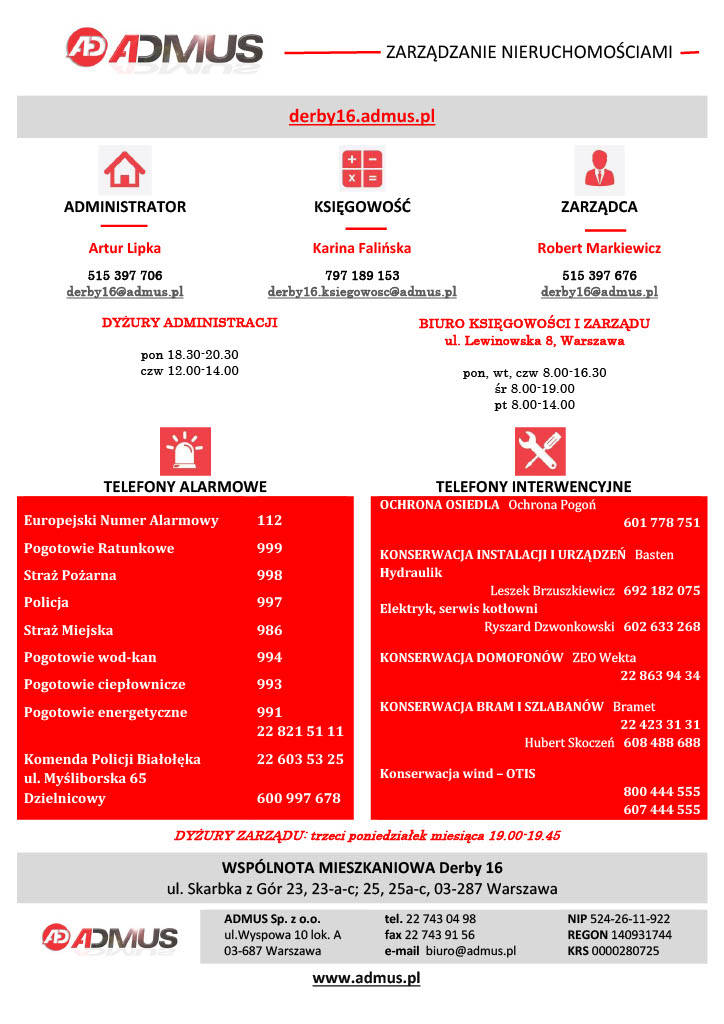 Uprzejmie informujemy, że nastąpiła zmiana w składzie zespołu firmy ADMUS obsługującego Państwa Wspólnotę. Od dnia 01.05.2022 roku stanowisko Zarządcy w miejsce Pana Adriana Zaręby objął Pan Robert Markiewicz, pozostający do Państwa dyspozycji pod numerem telefonu 515 397 676 oraz pod adresem e-mail derby16@admus.pl.